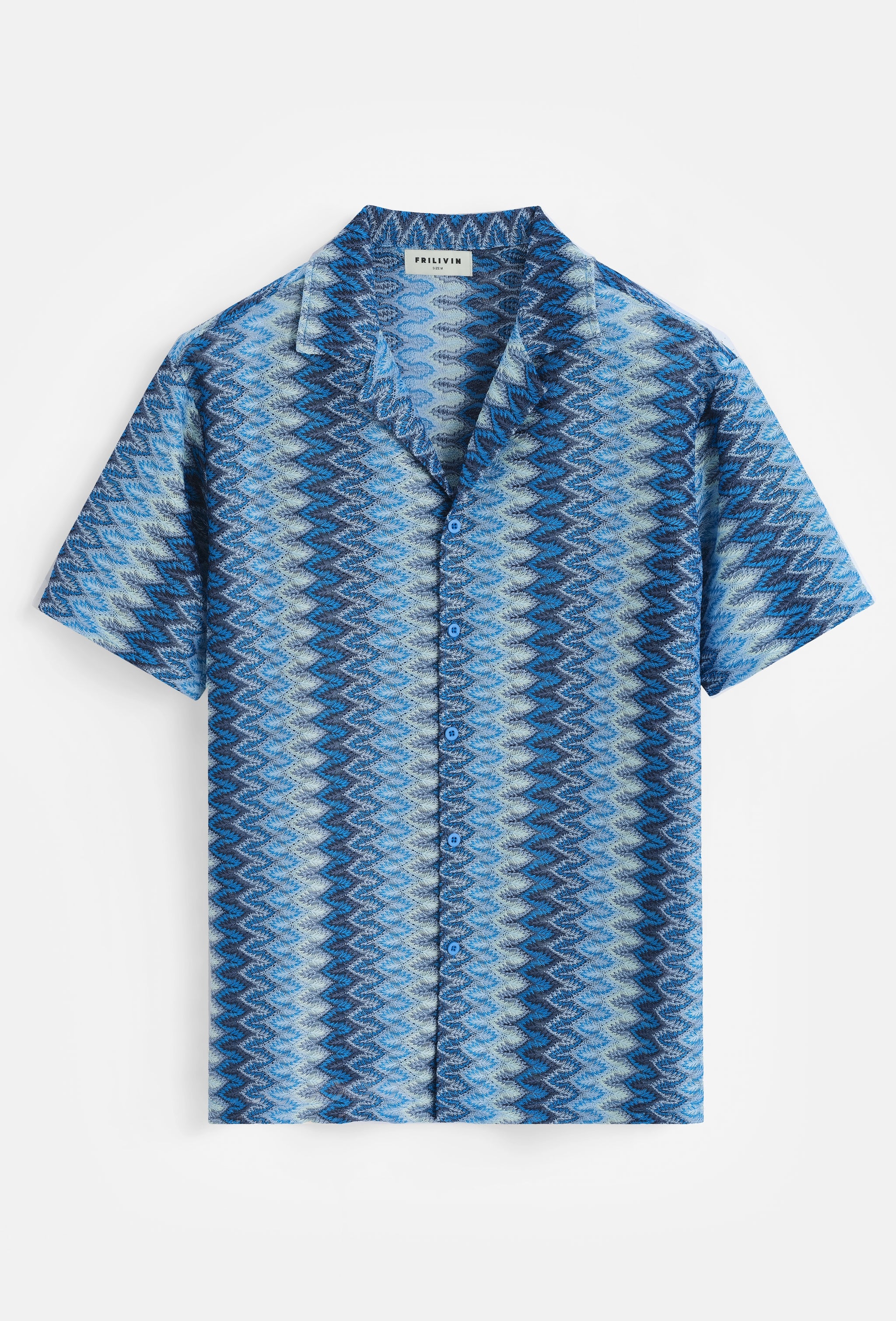 - L'image montre une chemise à manches courtes avec un motif géométrique en zigzag